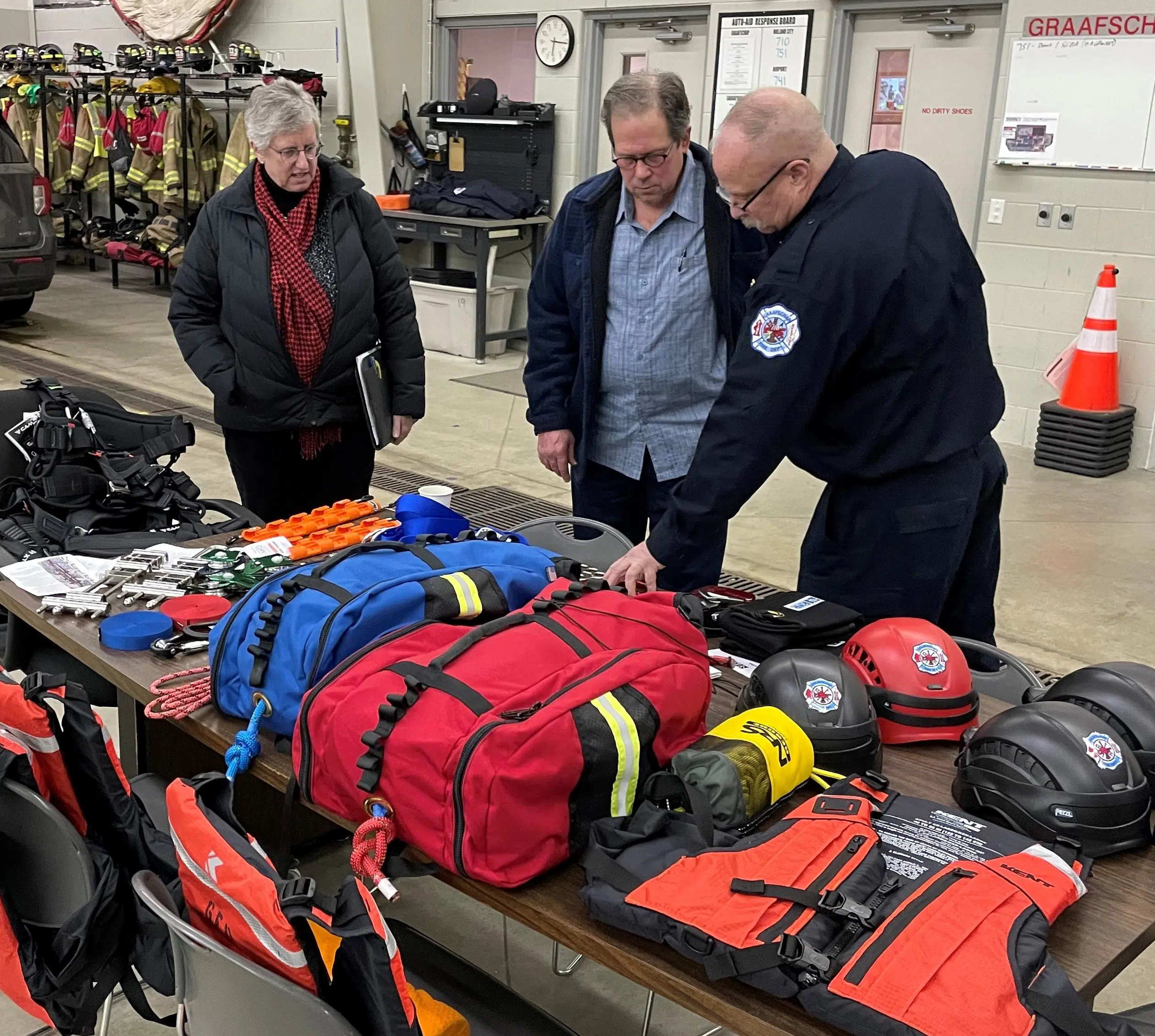 GRAAFSCHAP, MI (WHTC-AM/FM, Jan. 10, 2023) – Graafschap Fire Department Training and Safety Captain Dave Grumney talks about newly acquired equipment at the fire department, 4534 60th St., in Laketown Township, on Thursday, Jan. 5, 2023, to Graafschap Fire Board members Linda Howell of Laketown Township and Bob Yonker of Fillmore Township. The items include rappelling and other rescue equipment to replace older models.