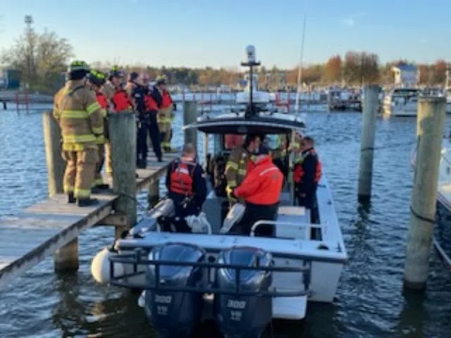 On Monday evening, crews from the Park Township Fire Department joined with members of the Ottawa County Sheriff’s Office Marine Unit for a couple of exercises at the Yacht Basin Marina in Lake Macatawa. They went through drills for a simulated fuel/dock fire, in which about 600 feet of fire hose went down the dock going to the fuel pumps, and with the Sheriff’s fire boat to go over its suppression capabilities.