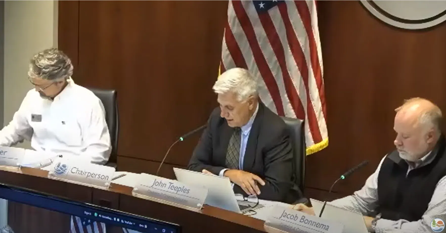 Sept. 23, 2025; West Olive, MI, USA; Ottawa County Board Chairman John Teeples (C), flanked by Commissioners Josh Brugger (L) and Jacob Bonnema (R), begins a business meeting in the main conference room of the Ottawa County Administration Building. (YouTube image courtesy Ottawa County, Michigan)